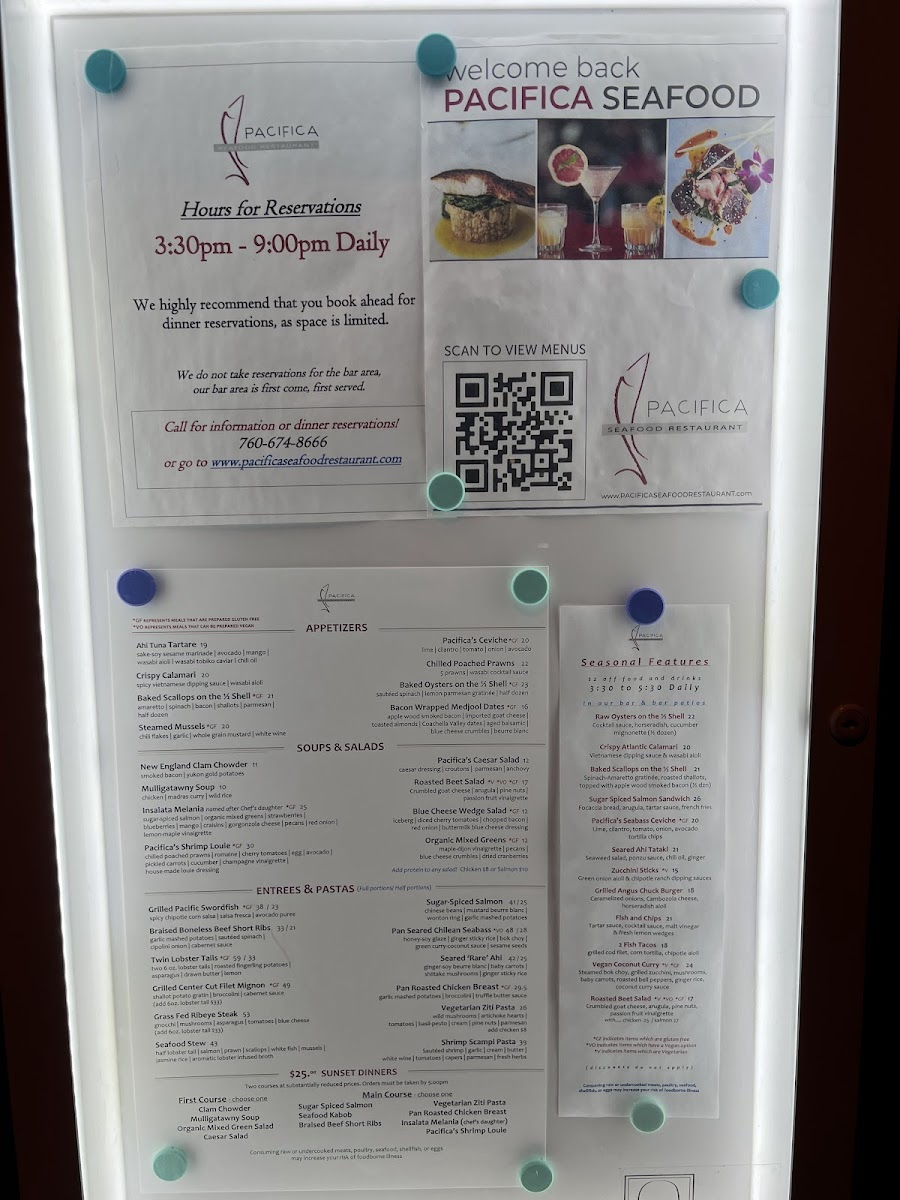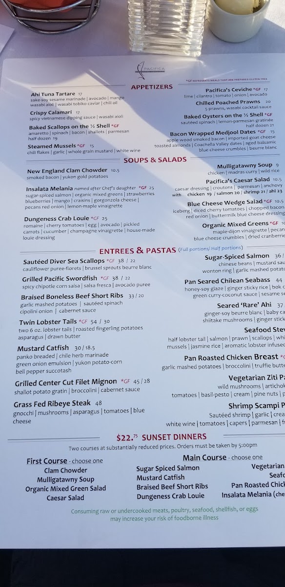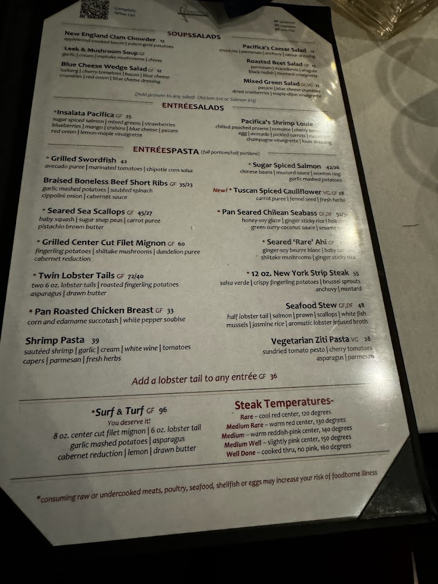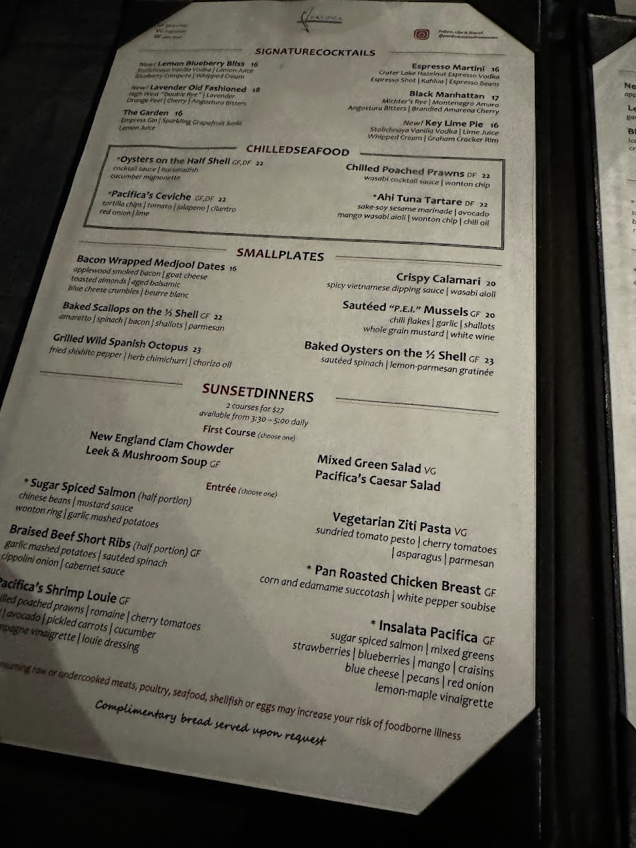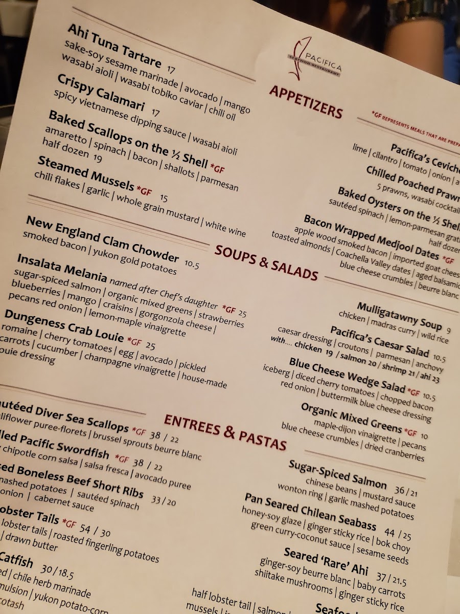 Main courses are a highlight, with choices ranging from the Sugar-Spiced Salmon to the succulent Grass Fed Ribeye Steak. Each plate promises an experience filled with rich flavors and vibrant ingredients, perfect for both seafood lovers and those seeking land-based options. The attentive service and inviting atmosphere enhance the overall dining experience, making Pacifica a must-visit for an upscale yet welcoming night out.