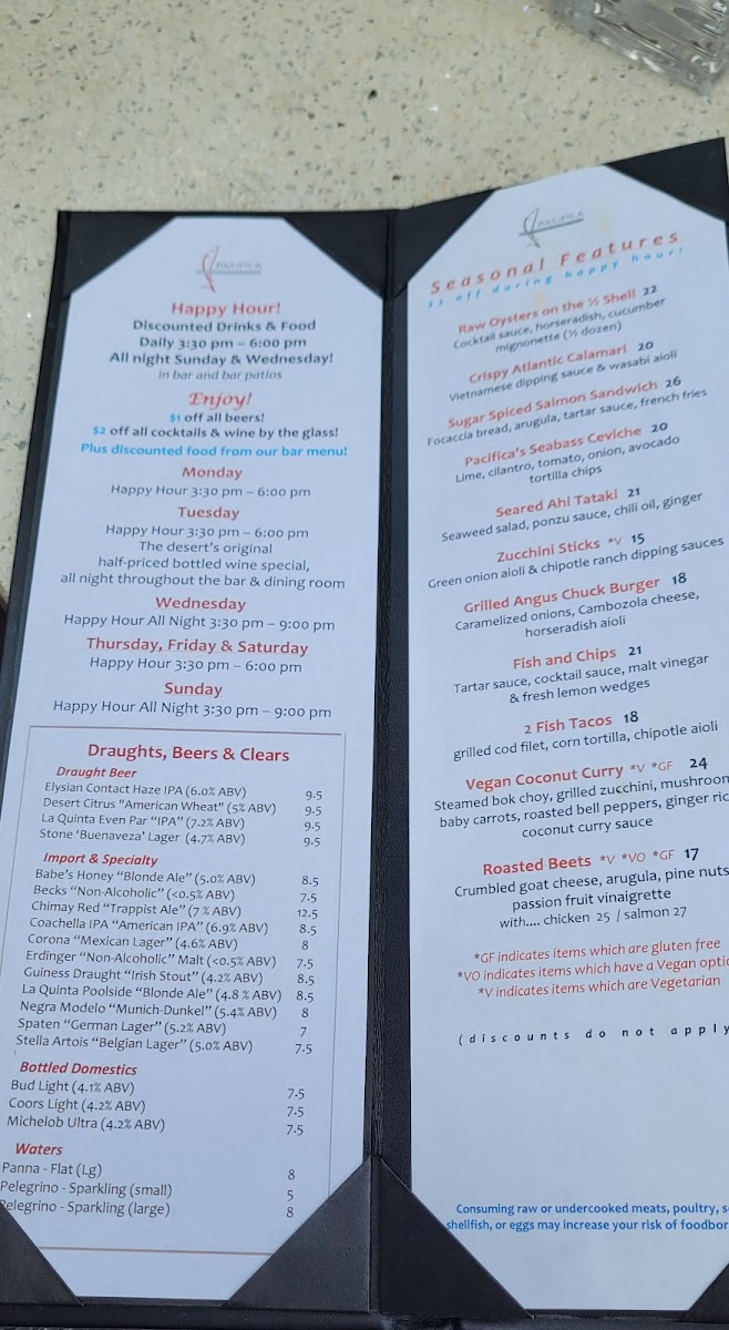 Welcome to Pacifica Seafood Restaurant, located in the heart of Palm Desert at 73505 El Paseo. This culinary gem combines the freshest seafood with an impressive variety of dishes that delight the senses. The menu features enticing options like the Shrimp Louie and a refreshing Caesar Salad, while appetizers such as Crispy Calamari and Ahi Tuna Tartare showcase Pacifica’s commitment to quality and presentation.